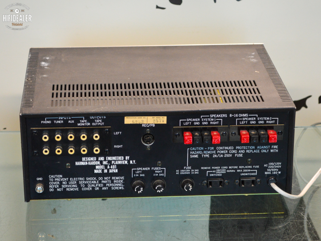 Harman Kardon A-401 on klassinen stereointegroitu vahvistin, jota valmistettiin noin vuosina 1975–1978. Se on suosittu vintage-äänentoiston harrastajien keskuudessa tyylikkään ulkonäkönsä ja lämpimän, miellyttävän 1970-luvun äänensä vuoksi.